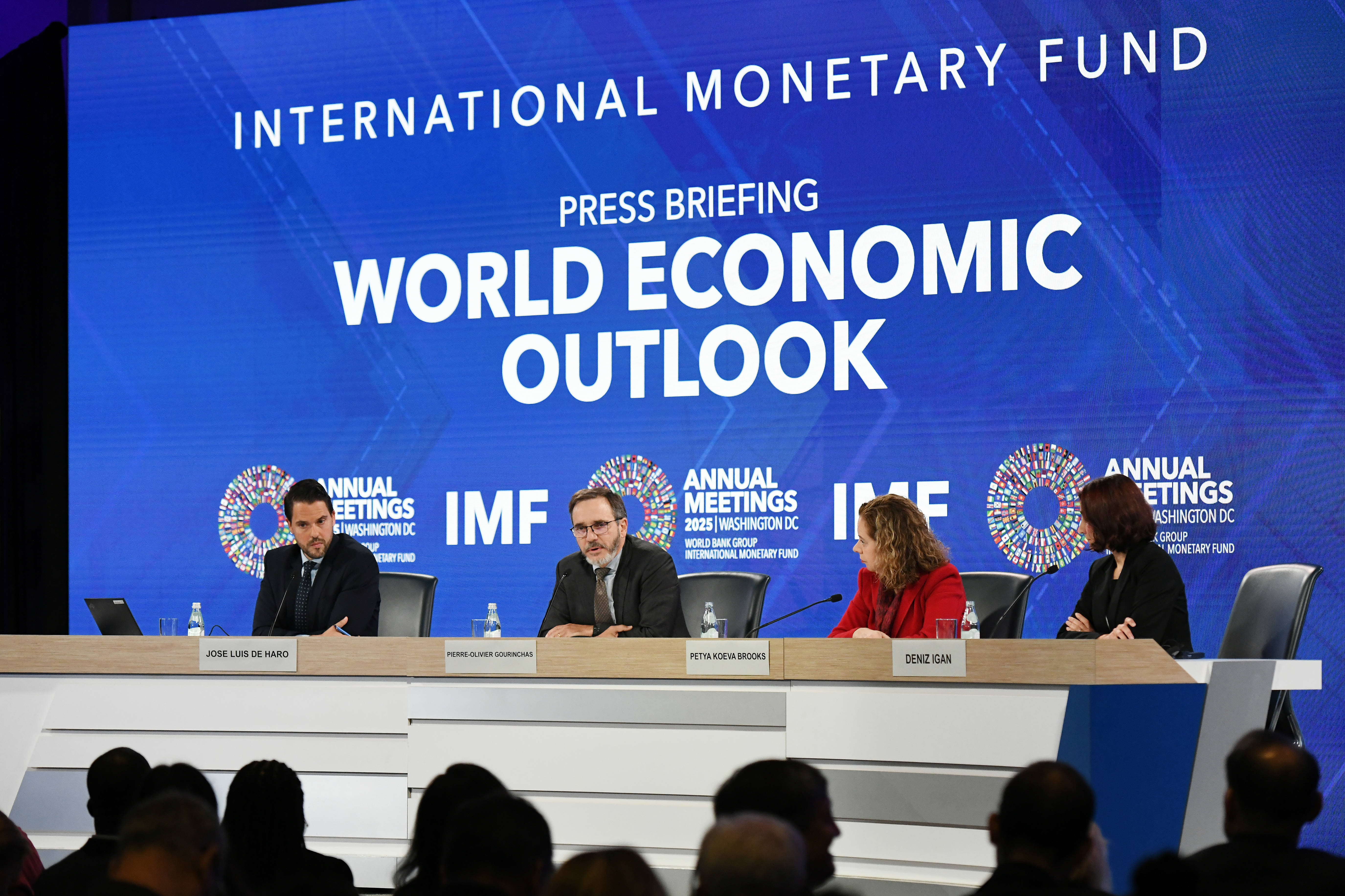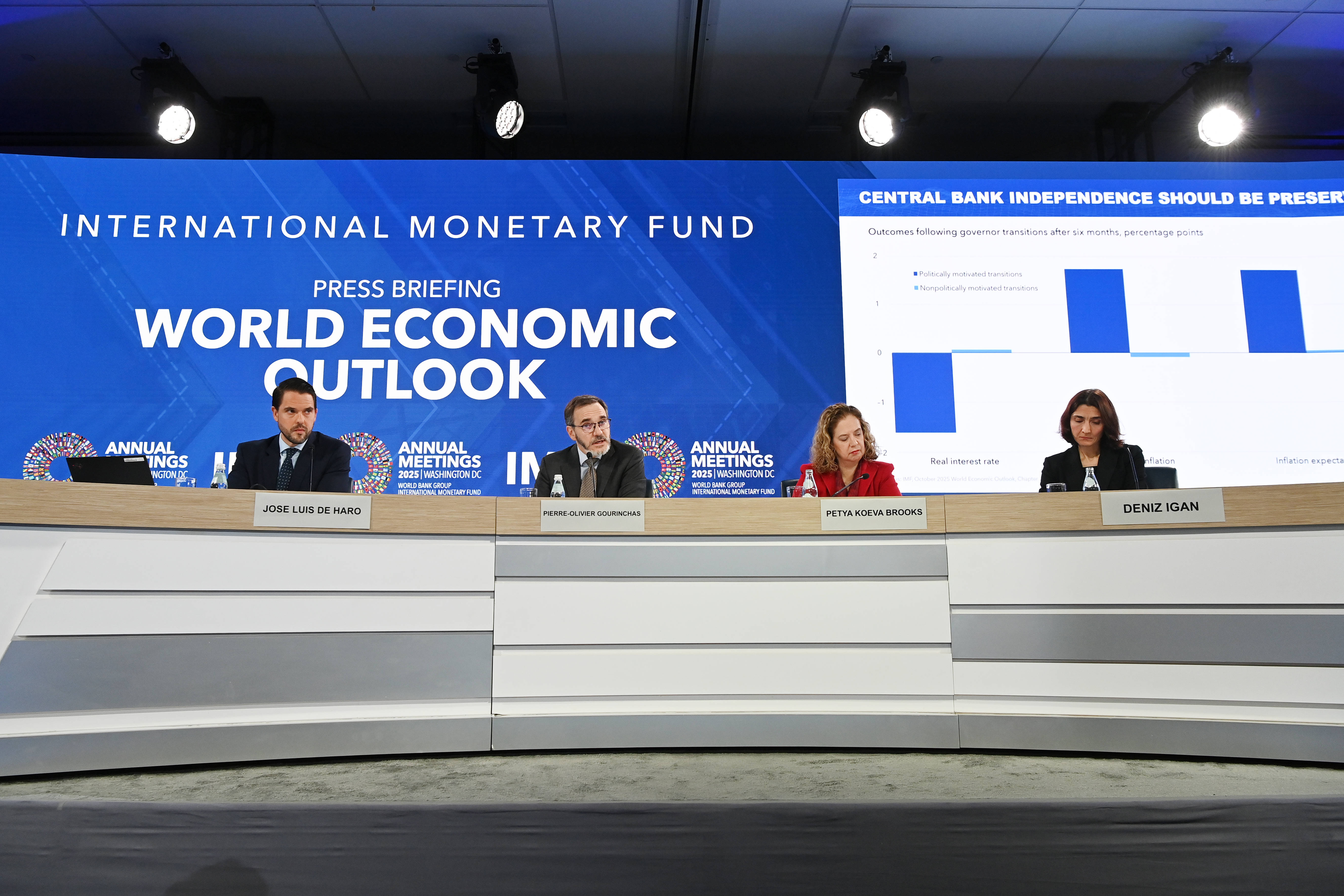 10月14日,在美国华盛顿,国际货币基金组织首席经济学家皮埃尔-奥利维耶·古兰沙(左二)在《世界经济展望报告》新闻发布会上讲话。 新华社记者 李睿 摄