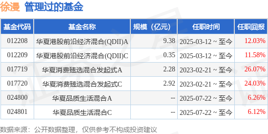 徐漫女士:硕士。2016年7月加入华夏基金管理有限公司,历任研究员、基金经理助理等。2023年2月21日担任华夏消费臻选混合型发起式证券投资基金基金经理。2025年3月12日担任华夏港股前沿经济混合型证券投资基金(QDII)基金经理。2025年7月22日担任华夏品质生活混合型证券投资基金基金经理。