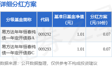 证券之星消息,10月15日发布《易方达年年恒春纯债一年定期开放债券型发起式证券投资基金分红公告》。本次分红为2025年度的第3次分红。公告显示,本次分红的收益分配基准日为9月9日,详细分红方案如下: