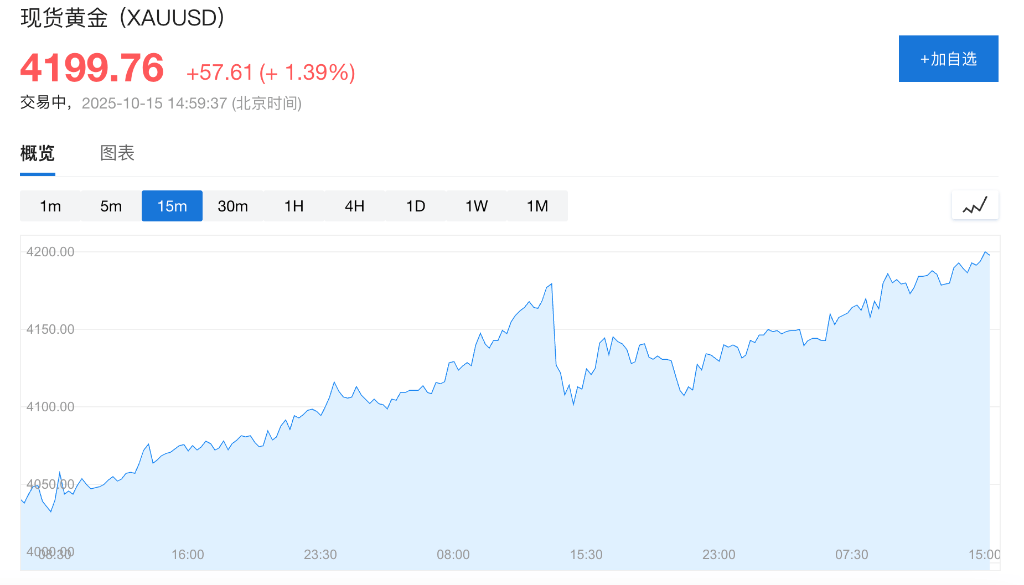 10月15日,亚洲股市上涨,欧股开盘普涨,欧股奢侈品股普涨,现货黄金突破4200美元/盎司,日内涨近1.4%。