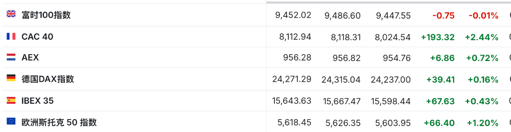 欧股开盘普涨,欧洲斯托克50指数涨1.27%,德国DAX指数涨0.2%,英国富时100指数涨0.25%,法国CAC40指数日内涨幅达2%。