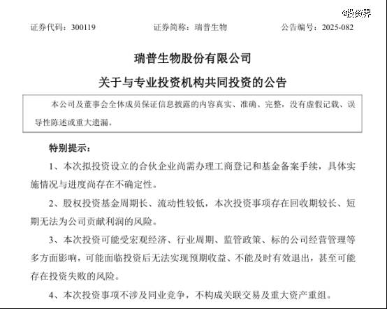 投资界-解码LP获悉,近日,瑞普生物发布公告,公司拟与天津港保税区新兴产业发展基金合伙企业(有限合伙)、天津临港股权投资基金管理有限公司、明智合信(天津)股权投资基金管理有限公司共同投资设立天津保瑞股权投资合伙企业(有限合伙)(暂定名),用于投资宠物产业链相关标的。基金认缴出资总额为4.06亿元,其中,瑞普生物作为有限合伙人出资1.54元。