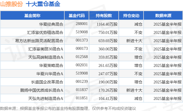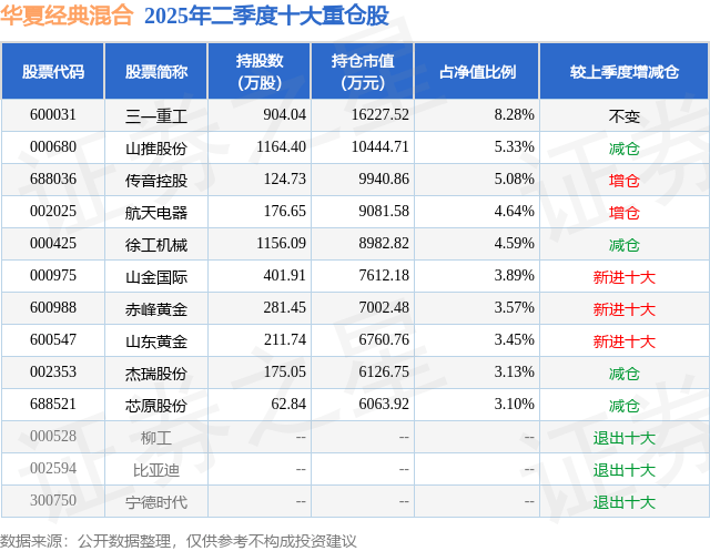 根据2025基金半年报公募基金重仓股数据,重仓该股的公募基金共28家,其中持有数量最多的公募基金为华夏基金的华夏经典混合。华夏经典混合目前规模为19.59亿元,最新净值2.394(10月14日),较上一交易日下跌0.66%,近一年上涨23.02%。该公募基金现任基金经理为刘心任。刘心任在任的基金产品包括:华夏翔阳两年定开混合,管理时间为2024年1月4日至今,期间收益率为44.73%;华夏臻选回报混合A,管理时间为2025年8月12日至今,期间收益率为10.12%;华夏信选混合A,管理时间为2025年9月12日至今,期间收益率为0.1%。