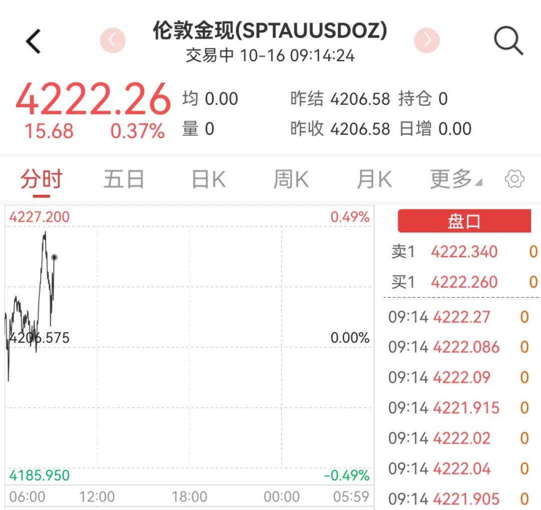 北京时间10月16日早盘,现货黄金升破4220美元/盎司,连续4个交易日创下新高,本周累涨200美元。截至发稿,现货黄金报4222.26美元/盎司,涨幅0.37%。
