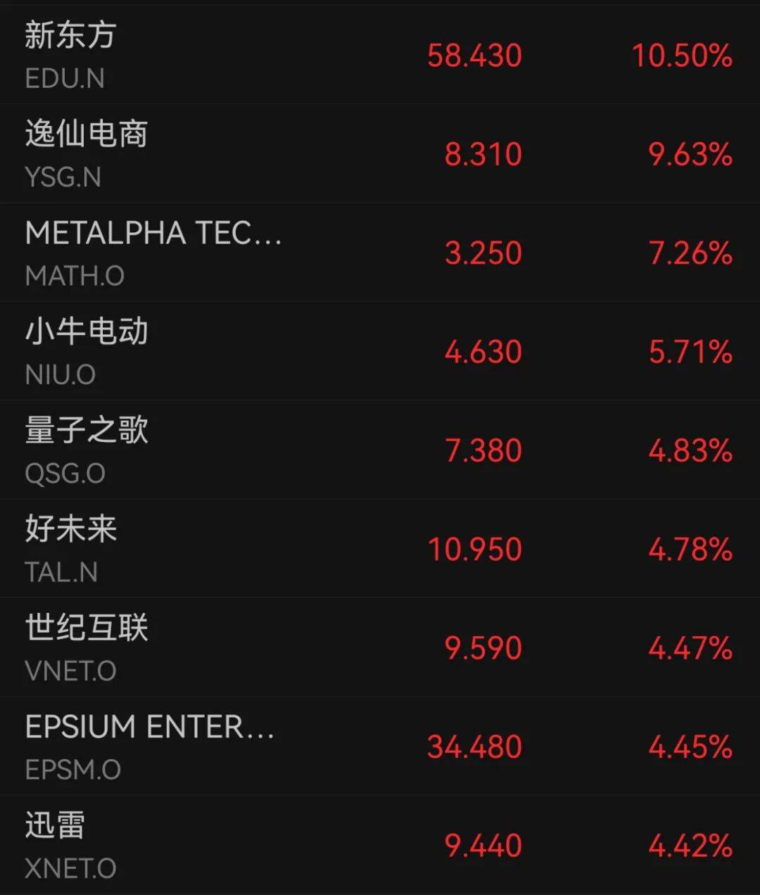 中概股多数上涨,纳斯达克中国金龙指数涨1.7%。在个股方面,新东方涨超10%,好未来涨逾4%,世纪互联涨超4%,满帮集团涨超3%,亚朵涨逾3%。