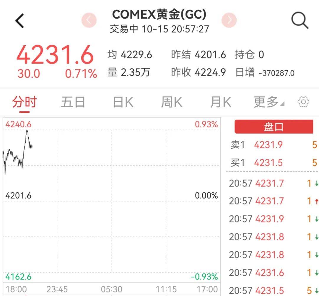 COMEX黄金继续冲高,报4231.6美元/盎司,涨幅0.71%。
