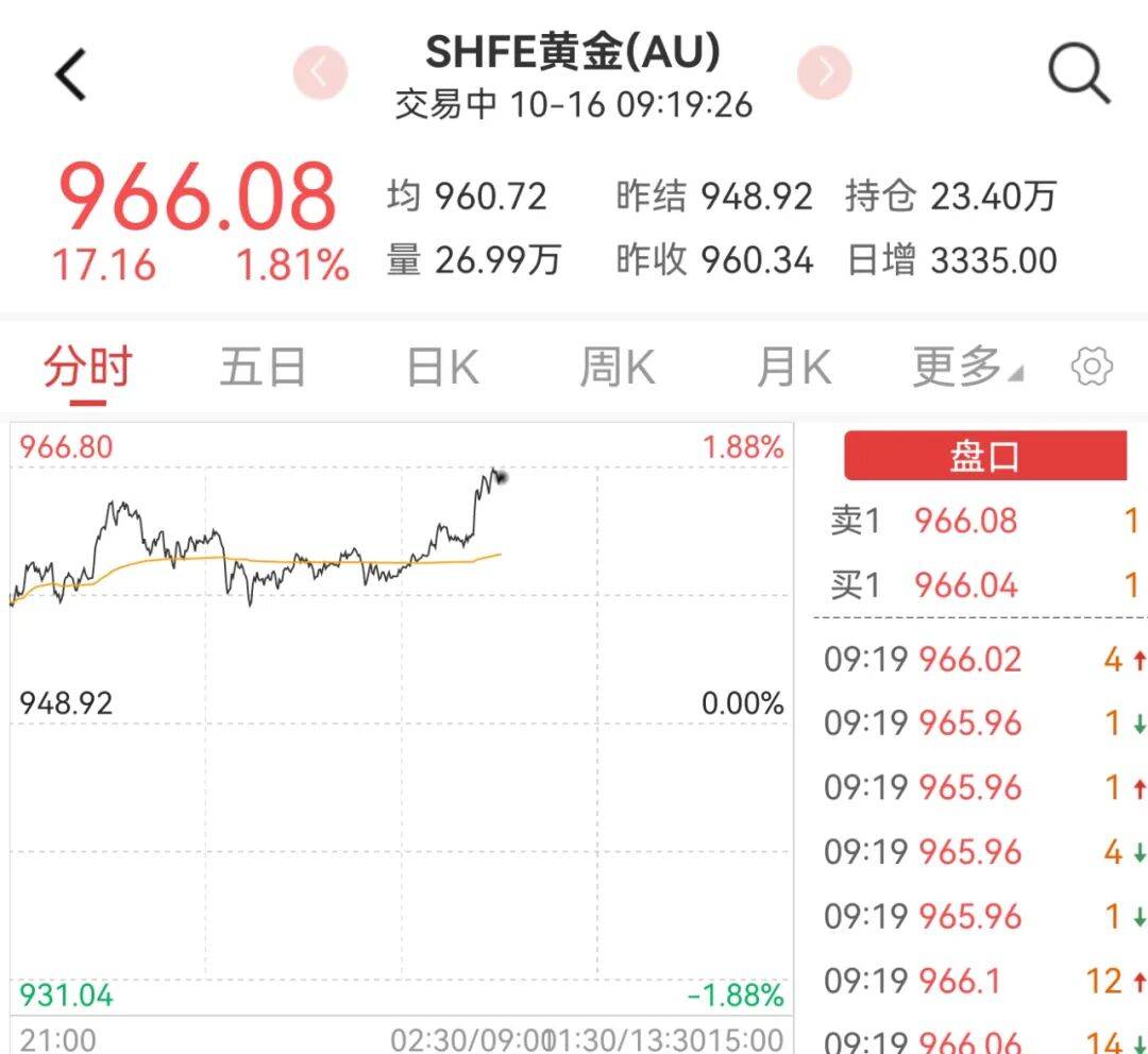 国内SHFE金高位震荡,报收966.08元/克,涨幅1.81%。