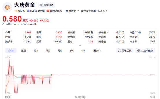 10月16日,港股黄金及贵金属板块延续昨日涨势,大唐黄金涨幅居前。截至11时12分,大唐黄金股价涨超9%。消息面上,澳新银行将今年底黄金价格预测上调至每盎司4400美元,预计到2026年6月将达到近每盎司4600美元的峰值。