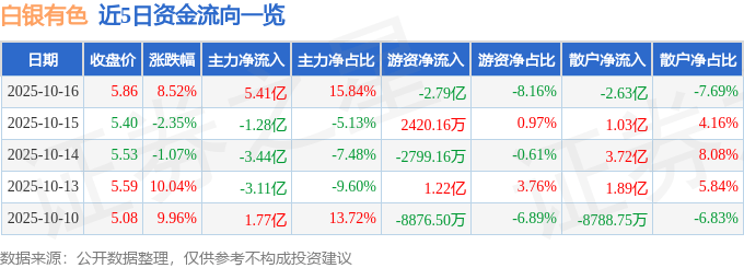 10月16日的资金流向数据方面,主力资金净流入5.41亿元,占总成交额15.84%,游资资金净流出2.79亿元,占总成交额8.16%,散户资金净流出2.63亿元,占总成交额7.69%。