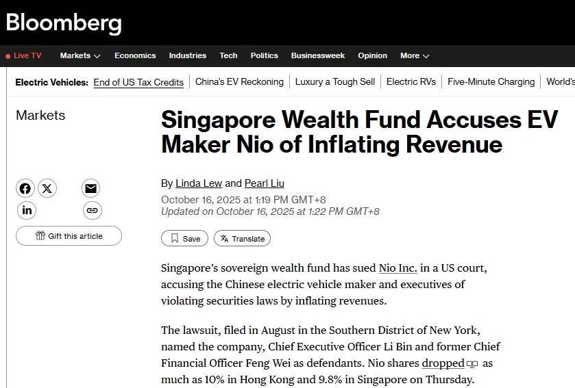 蔚来被新加坡主权财富基金起诉,涉及虚增收入