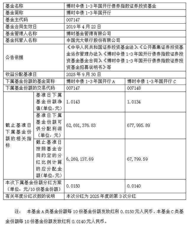 10月16日,博时基金公布博时中债1-3年国开行债券指数证券投资基金分红公告。根据公告,博时中债1-3年国开行A类基金(007147)份额每10份基金份额发放红利0.0150元人民币,博时中债1-3年国开行C类基金(007148)份额每10份基金份额发放红利0.0140元人民币。本次分红为2025年度的第3次分红。