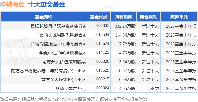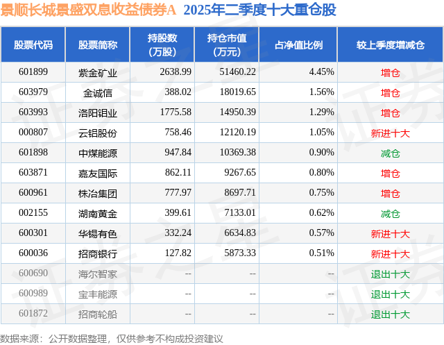 根据2025基金半年报公募基金重仓股数据,重仓该股的公募基金共8家,其中持有数量最多的公募基金为景顺长城基金的景顺长城景盛双息收益债券A。景顺长城景盛双息收益债券A目前规模为105.57亿元,最新净值1.23(10月15日),较上一交易日上涨0.24%,近一年上涨9.43%。该公募基金现任基金经理为李怡文 邹立虎 李曾卓卓。李怡文在任的基金产品包括:景顺长城景颐双利债券A,管理时间为2021年4月30日至今,期间收益率为24.4%;景顺景颐招利6个月持有期债券A,管理时间为2021年4月30日至今,期间收益率为33.67%;景顺长城安泽回报一年持有混合A,管理时间为2021年4月30日至今,期间收益率为38.7%;景顺景颐嘉利6个月持有期债券A,管理时间为2021年6月16日至今,期间收益率为22.73%。邹立虎在任的基金产品包括:景顺长城安盈回报一年持有混合A,管理时间为2021年11月16日至今,期间收益率为42.31%;景顺景颐招利6个月持有期债券A,管理时间为2022年3月12日至今,期间收益率为26.09%;景顺长城华城稳健6个月持有期混合A,管理时间为2022年3月12日至今,期间收益率为29.85%。