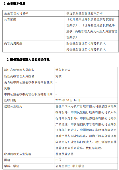 中国经济网北京10月16日讯 今日,信达澳亚基金公告,任命方敬为财务负责人,原财务负责人朱永强退休。