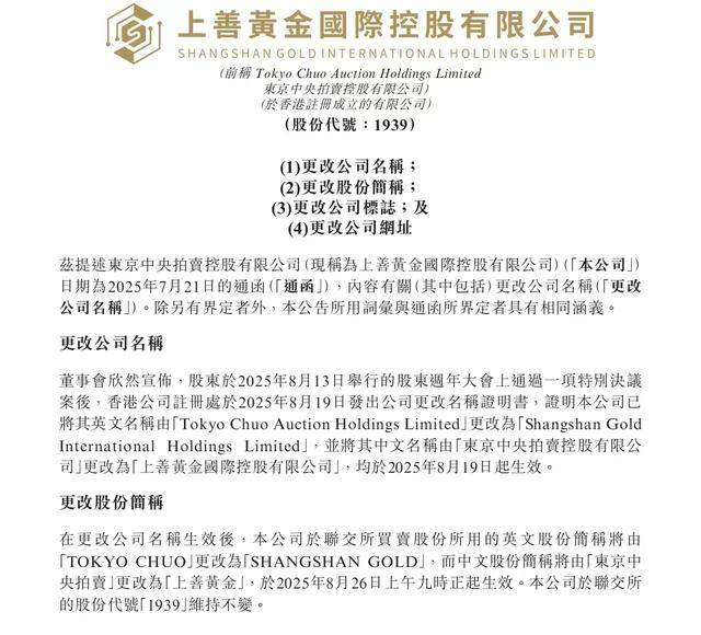 东京中央拍卖更名为“上善黄金国际控股有限公司”