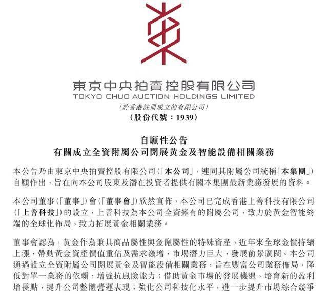 值得关注的是,今年5月,金雅福集团董事长黄仕坤实控的ESSA FINANCIAL及其一致行动人,出手收购了香港主板上市公司东京中央拍卖75%的股权,黄仕坤董事长顺势成为东京中央拍卖的实际控制人。8月15日,京东中央拍卖公告已完成香港上善科技有限公司的设立,后者作为其全资拥有的附属公司,致力于黄金智能终端的全球化布局,拓展黄金相关业务。公司公告称,此举旨在丰富业务佈局,增强抗风险能力,借助黄金市场的发展机遇,培育新的盈利增长点;强化公司科技化水平,进一步提升市场综合竞争力;同时借助香港的区位及国际化优势,拓展全球市场。8月22日东京中央拍卖更名为“上善黄金国际控股有限公司”。