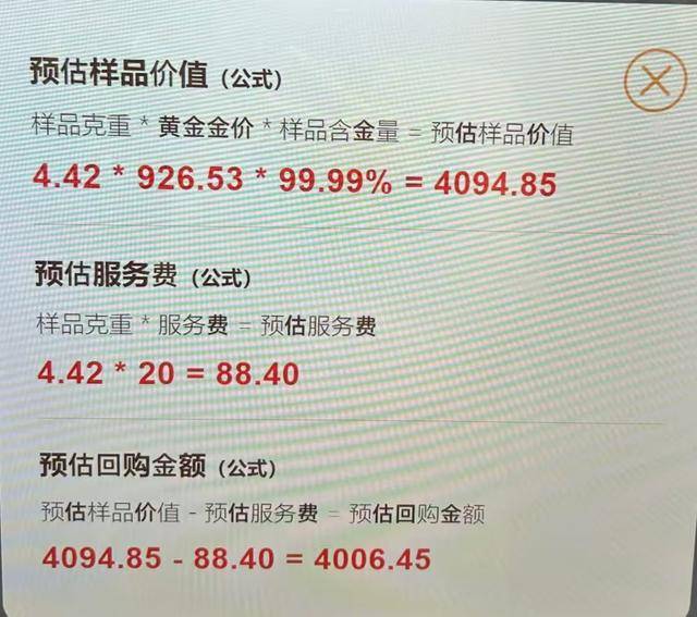 检测后结合金价给出预估样品价值,以及扣除服务费的预估回购金额等信息