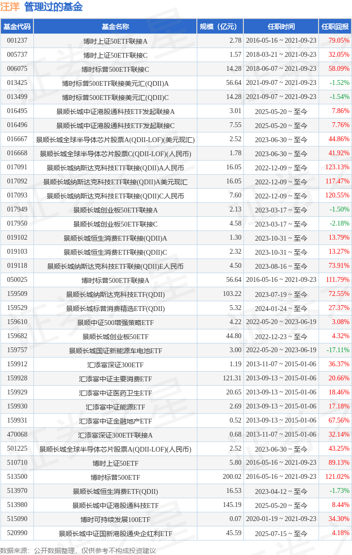 汪洋先生:国籍:中国,1980年出生,金融工程及计算机科学双硕士。相关业务资格:证券投资基金从业资格。从业经历:2009年起曾任华泰联合证券有限责任公司金融工程高级研究员,华泰柏瑞基金管理有限公司基金经理助理。2013年5月6日加入汇添富基金管理股份有限公司,负责指数及ETF产品的投资、研究工作,2013年9月13日起任汇添富中证主要消费ETF基金经理、汇添富中证医药卫生ETF基金经理、汇添富中证能源ETF基金经理、汇添富中证金融地产ETF基金的基金经理,2013年11月7日起任深证300交易型开放式指数证券投资基金及其联接基金的基金经理。2015年加入博时基金管理有限公司,历任指数投资部总经理助理、指数投资部副总经理。现任指数与量化投资部副总经理,曾任博时上证50ETF联接基金(2016年5月16日至2021年9月23日)的基金经理。博时中证可持续发展100交易型开放式指数证券投资基金基金经理(2020年1月19日至2021年9月23日),博时标普500ETF基金基金经理(2016年5月16日至2021年9月23日),博时上证50ETF基金基金经理(2016年5月16日至2021年9月23日),博时标普500ETF联接(QDII)基金基金经理(2016年5月16日至2021年9月23日)。2022年5月20日至2023年6月19日担任景顺长城中证500增强策略交易型开放式指数证券投资基金的基金经理。曾任景顺长城国证新能源车电池交易型开放式指数证券投资基金基金经理、景顺长城全球半导体芯片产业股票型证券投资基金(QDII-LOF)基金经理。2025年5月20日起担任景顺长城中证港股通科技交易型开放式指数证券投资基金、景顺长城中证港股通科技交易型开放式指数证券投资基金发起式联接基金基金经理。2025年7月15日起担任景顺长城中证国新港股通央企红利交易型开放式指数证券投资基金基金经理。2025年8月13日担任景顺长城国证港股通红利低波动率交易型开放式指数证券投资基金基金经理。