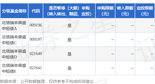 证券之星消息,10月17日北信瑞丰基金管理有限公司发布《北信瑞丰鼎盛中短债债券型证券投资基金基金暂停(大额)申购(转换转入、赎回、转换转出、定期定额投资)公告》。公告中提示,为保护现有基金份额持有人的利益,保障基金平稳运作,自2025年10月17日起北信瑞丰鼎盛中短债债券型证券投资基金基金暂停(大额)申购(转换转入、赎回、转换转出、定期定额投资),下属分级基金调整明细如下: