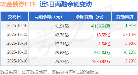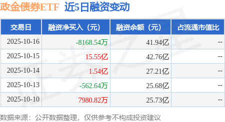 证券之星消息,10月16日,政金债券ETF(511520)融资买入1.14亿元,融资偿还1.96亿元,融资净卖出8168.54万元,融资余额41.94亿元,近20个交易日中有11个交易日出现融资净买入。