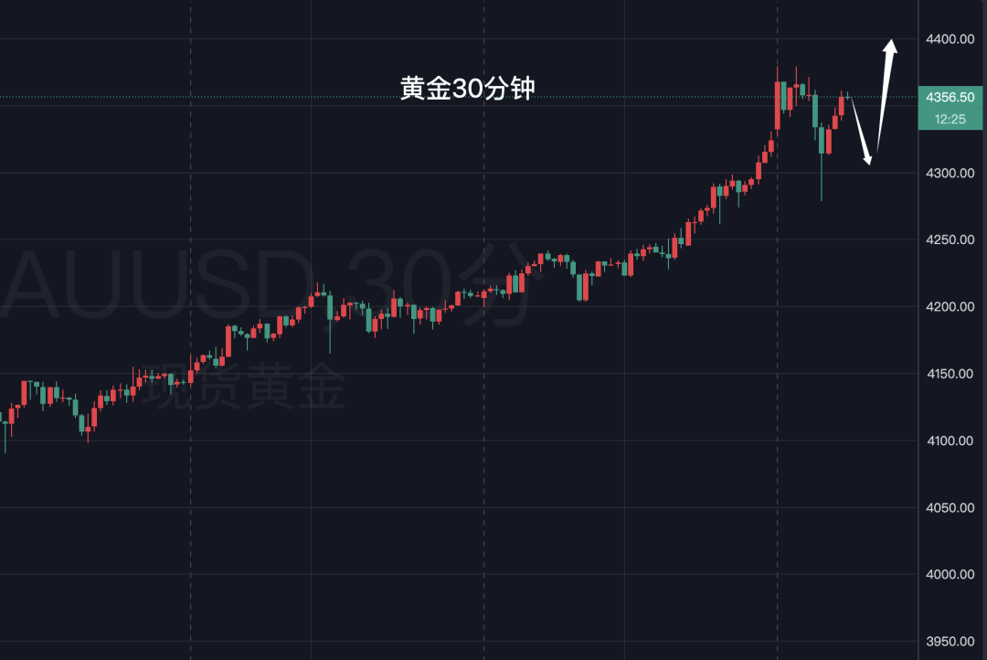 黄金,早上冲高后快速回调,又是100美元的节奏,这和我昨天在《黄金,进入疯牛阶段!》一文强调了涨200-300美元就会迎来100美元左右的快速下跌,而这个下跌关键在于会不会延续,二次4280的破位将意味多头的结束,这是衡量多空的关键手段,也是我判断行情见顶的标准。