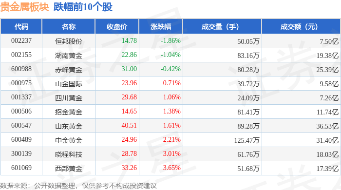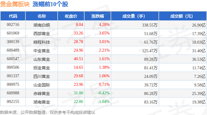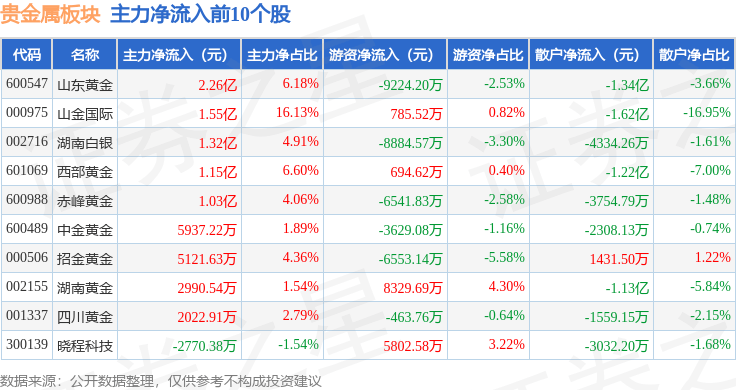 从资金流向上来看,当日贵金属板块主力资金净流入8.1亿元,游资资金净流出1.49亿元,散户资金净流出6.61亿元。贵金属板块个股资金流向见下表: