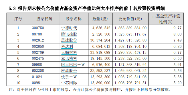 三季度,该基金的股票仓位由92.42%降至85.50%,同时对重仓股组合进行优化。具体来看,基金增持了恩捷股份、快手、天赐材料、阿里巴巴、中芯国际,减持了宁德时代、腾讯控股、科达利、立讯精密、应流股份。其中,天赐材料三季度股价翻倍,涨幅超110%;立讯精密、中芯国际、科达利三季度涨幅均在70%以上。