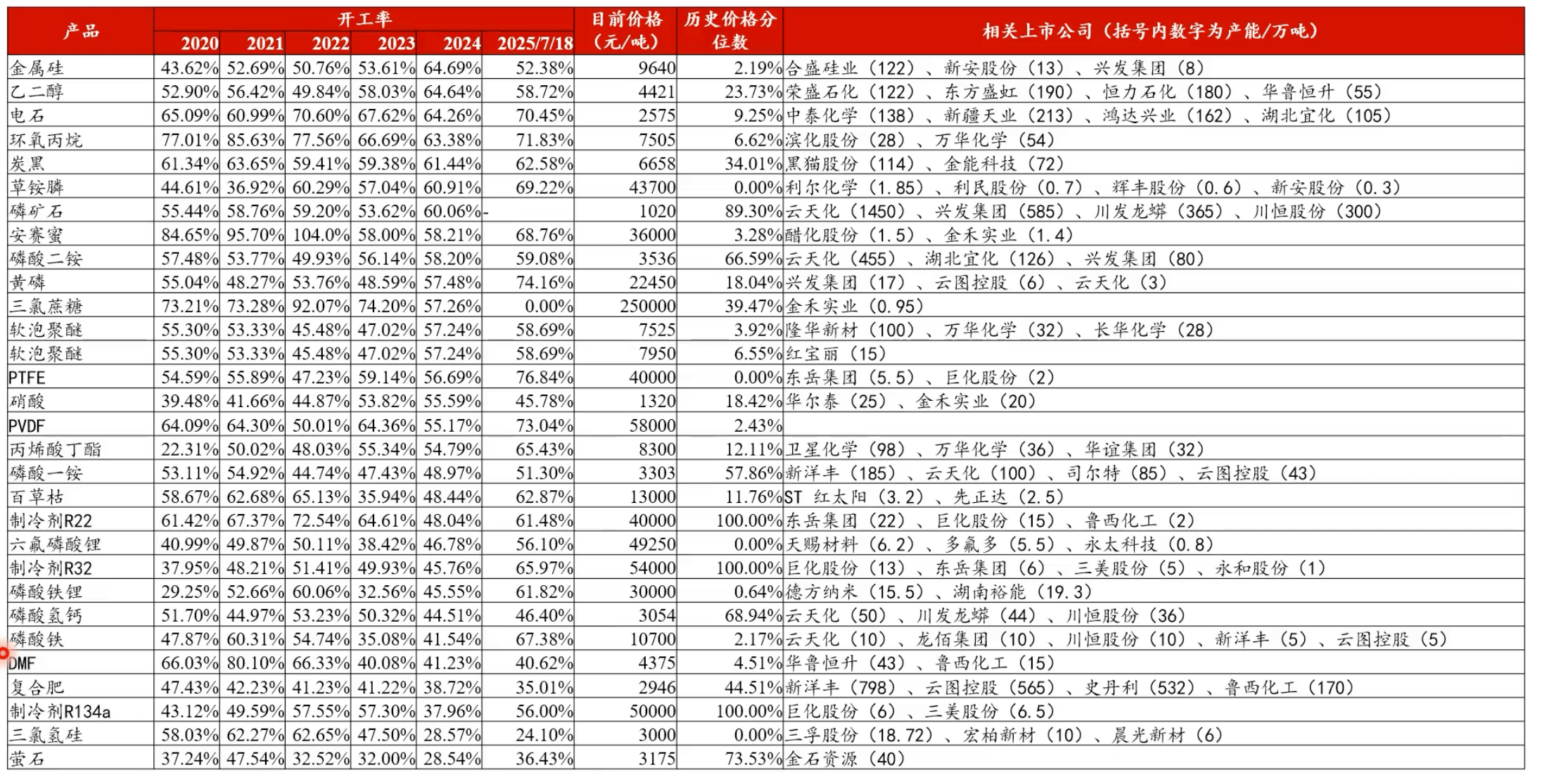(2)开工率:把化工共12个细分行业的开工率做汇总,通过加权平均计算之后,可以发现目前的行业开工率大概为67.79%,处于历史95%分位点,这说明整体化工行业开工率已几乎快回到新高水平,这主要系国内化工企业抢占了国际市场众多份额,目前中国的化工已经占到了全世界约43%的份额。海外尤其是欧洲化工企业出清原因则主要系在不用俄罗斯管道器后,采用了美国的 LNG,导致能源成本大幅抬升。