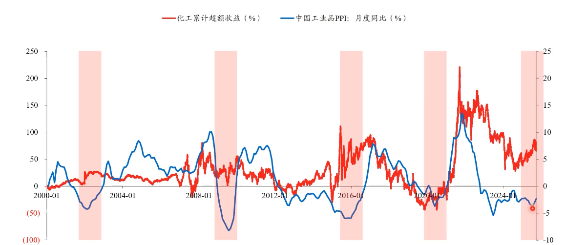 (2)化工板块股价累计超额和PPI月度同比走势正相关:经验表明,当 PPI 月度同比拐点往上时,化工板块就有超额收益。那需要等到PPI回正吗?不用。因为PPI月度同比拐点出现的时候,配置化工机会就已经来了。