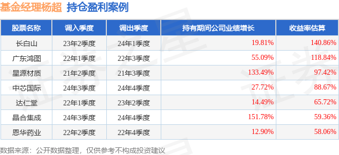 杨超管理的金信消费升级股票A基金在23年2季度买入长白山,在持有3个季度后在24年1季度卖出。持有期间的估算收益率为140.86%,持有期间长白山在2023年到2024年的年报营业总收入增幅达19.81%。