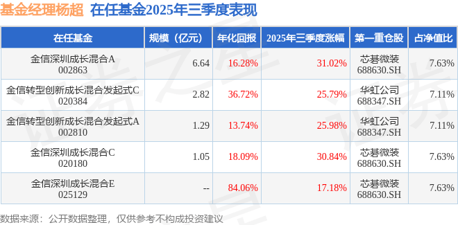 证券之星消息,截止2025年三季度末,基金经理杨超旗下共管理5只基金,本季度表现最佳的为金信深圳成长混合A(002863),季度净值涨31.02%。
