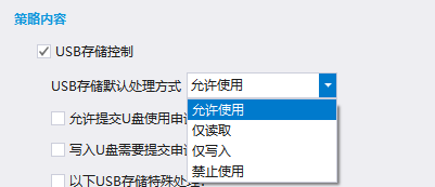 U盘四档模式:支持禁止使用、仅读取、仅写入、允许使用(需审批)四种模式,记录插拔时间、设备型号、操作账号。