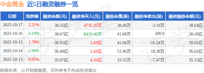 中金黄金融资融券信息显示,融资方面,当日融资买入5.89亿元,融资偿还5.41亿元,融资净买入4735.35万元。融券方面,融券卖出4.12万股,融券偿还7.31万股,融券余量38.49万股,融券余额960.74万元。融资融券余额38.64亿元。