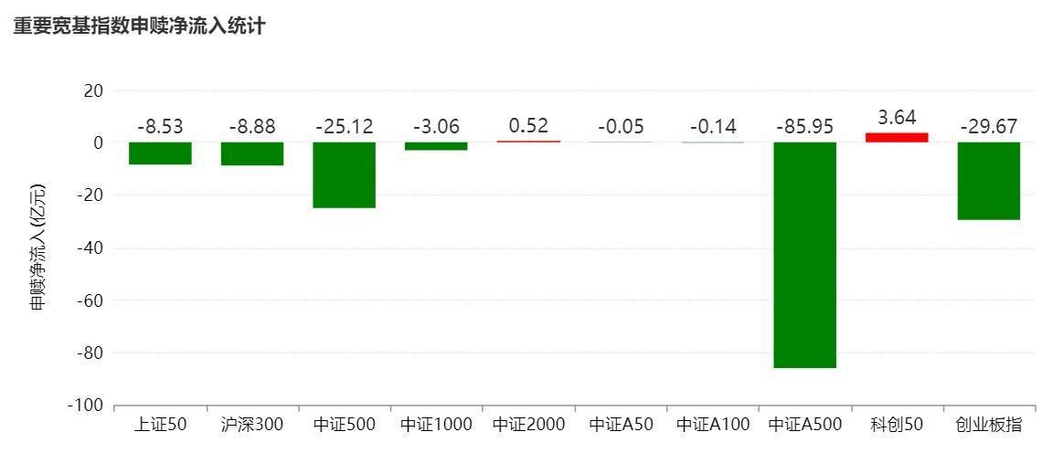细分来看,主要宽基指数整体资金申赎统计显示,本周科创50净流入3.64亿元,中证A500净流出85.95亿元。