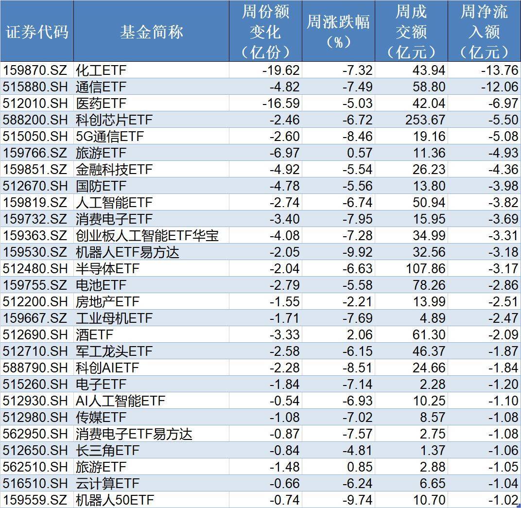 在资金流出方面,本周有27只行业主题ETF净流出逾1亿元,其中化工ETF、通信ETF和医药ETF份额分别减少19.62亿份、4.82亿份和16.59亿份,分别净流出资金13.76亿元、12.06亿元和6.97亿元。