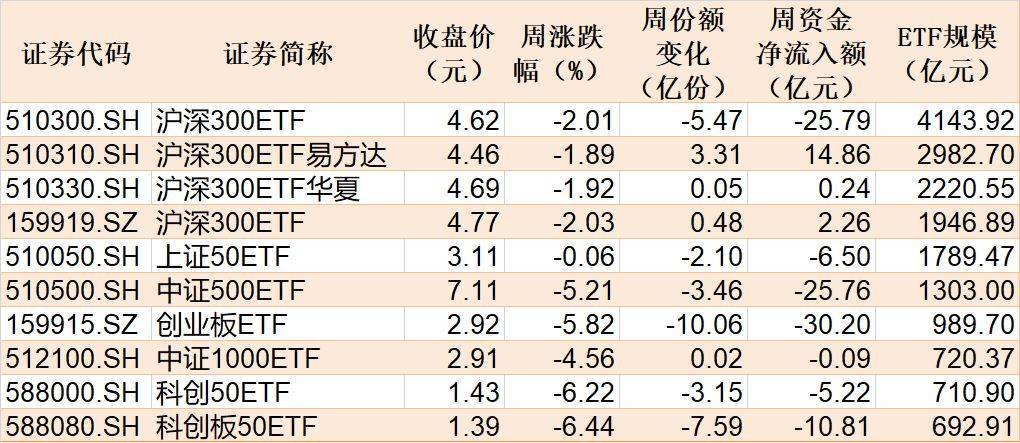 具体ETF方面,规模较大的10只宽基指数ETF本周合计净流出87.01亿元,其中沪深300ETF、中证500ETF、创业板ETF净流出均超25亿元。