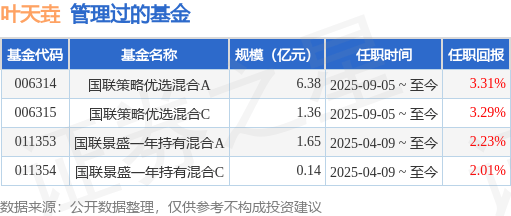 叶天垚先生:中国国籍,毕业于中国人民大学数量经济学专业,研究生、硕士学位,具有基金从业资格。2021年6月至2022年3月任中邮创业基金管理股份有限公司研究部研究员;2022年3月至2023年9月任中信建投基金管理有限公司多元资产配置部研究员。2023年9月加入公司,现任多策略投资部基金经理。2025年04月09日担任国联景盛一年持有期混合型证券投资基金基金经理。2025年9月5日担任国联策略优选混合型证券投资基金基金经理。