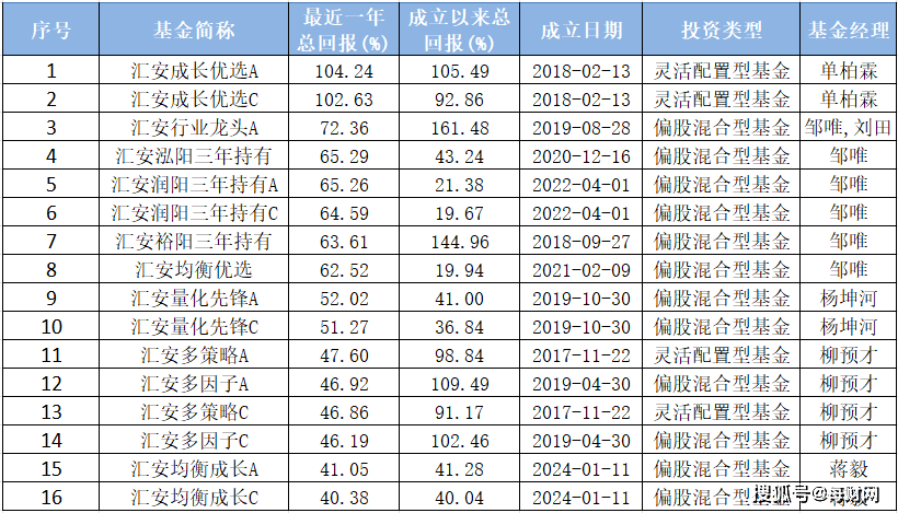 Wind数据显示,截至10月15日,汇安基金旗下成立以来业绩翻倍的基金达9只(A/C类分开计算)。其中,近一年回报翻番的有2只,回报超50%的有10只,超40%的高达16只。尤为突出的是,新生代基金经理单柏霖管理的汇安成长优选A年内收益率达104.24%,大幅超越基准;老将邹唯管理的6只基金年内收益率也均超过60%。
