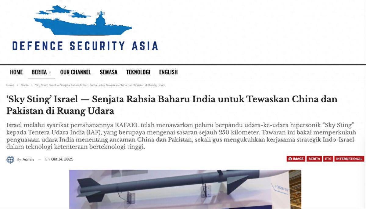 近日《防务亚洲》网站报道,以色列防务商拉斐尔公司正在与印度空军就一款名为“Sky Sting”(天空之刺)的远程空对空导弹交易计划进行谈判,《防务亚洲》网站透露,该交易计划的主要事项是该公司计划向印度空军出口“Sky Sting”远程空空导弹,以色列方面称该空空导弹采用了三脉冲发动机,最大射程将达到250千米!这样的一款空空导弹自然是印度空军求之不得的,因为5·7印巴空战印度空军吃亏的原因之一就是空空导弹射程不如巴空军,全程被霹雳-15E压着打,如果能从以色列引进射程250千米的远程空空导弹,印度空军自然是非常感兴趣的。