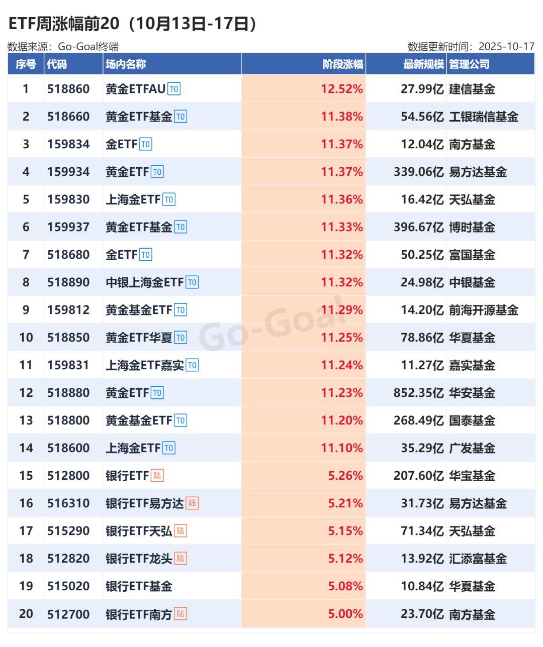 上证报中国证券网讯(记者 汪友若)本周,A股三大指数整体下行,上证指数周跌幅为1.47%,深证成指下跌4.99%,创业板指下跌5.71%。黄金成为全周最受瞩目的资产,国际金价一路飙升,连续刷新历史高点。Go-Goal ETF数据显示,多只黄金ETF本周涨幅较前,其中黄金ETFAU上涨12.52%,涨幅居首。此外,银行相关ETF普遍上涨。跌幅方面,机器人、智能驾驶相关ETF跌幅居前,普遍跌幅在9%以上。