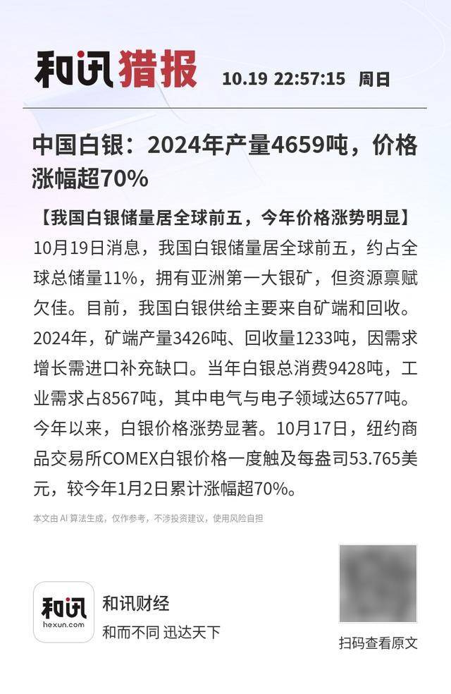 【我国白银储量居全球前五,今年价格涨势明显】10月19日消息,我国白银储量居全球前五,约占全球总储量11%,拥有亚洲第一大银矿,但资源禀赋欠佳。目前,我国白银供给主要来自矿端和回收。2024年,矿端产量3426吨、回收量1233吨,因需求增长需进口补充缺口。当年白银总消费9428吨,工业需求占8567吨,其中电气与电子领域达6577吨。今年以来,白银价格涨势显著。10月17日,纽约商品交易所COMEX白银价格一度触及每盎司53.765美元,较今年1月2日累计涨幅超70%。
