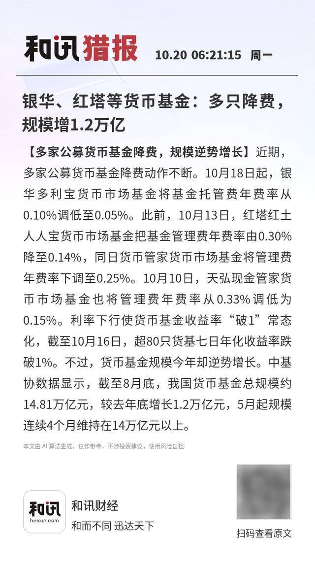 银华、红塔等货币基金:多只降费,规模增1.2万亿