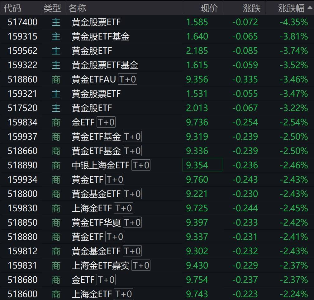 ETF方面,黄金股相关ETF跌超3%,商品黄金相关ETF跌超2%。
