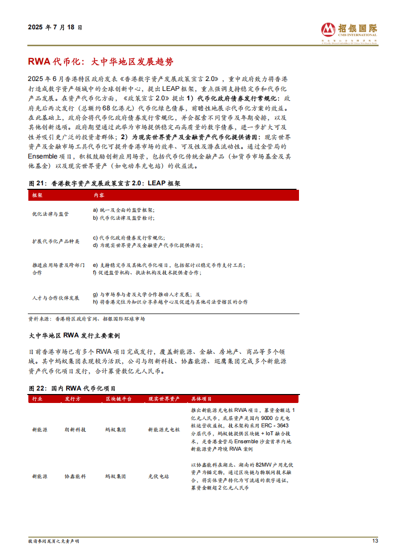 大中华地区尤其是香港,成为RWA代币化发展的重要阵地。2025年6月香港发布《数字资产发展政策宣言2.0》,提出LEAP框架支持稳定币和代币化产品发展,推动代币化政府债券发行常规化。目前香港市场已涌现多个RWA项目,覆盖新能源、金融、房地产等领域,蚂蚁集团、OSL集团、HashKey等企业积极布局技术解决方案与项目发行,渣打银行Libeara等平台则提供专业代币化服务。