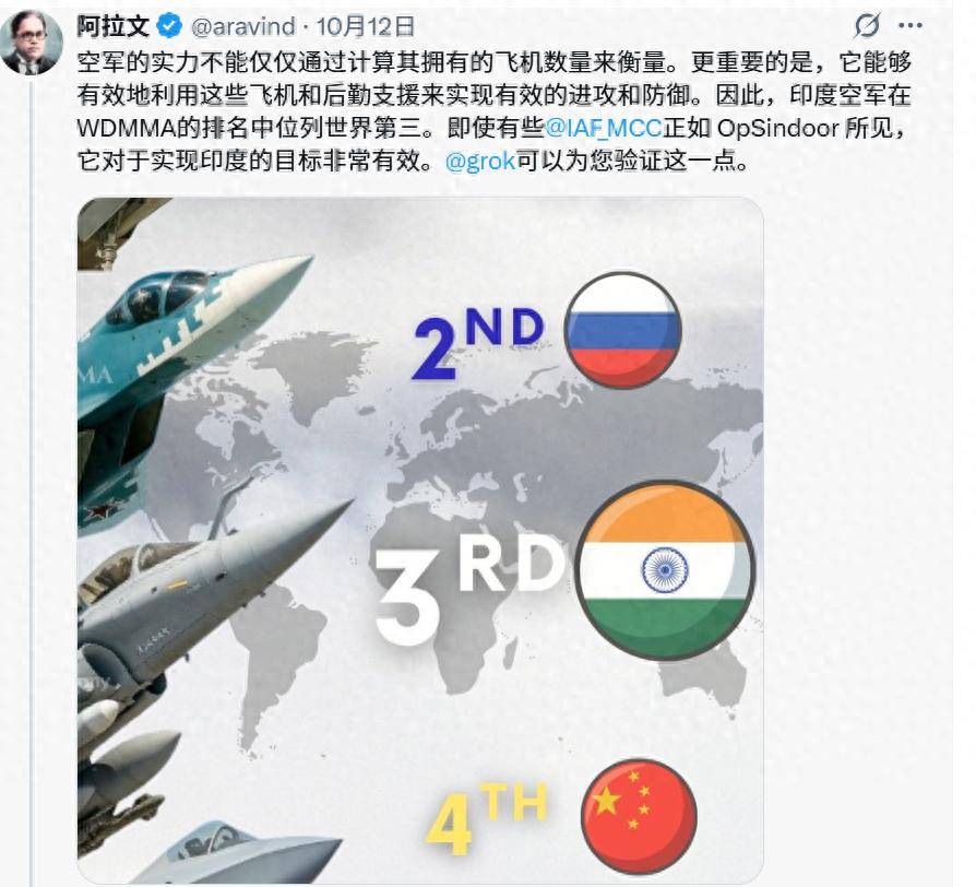 美国空军第一,美国海军第二,俄罗斯空军第三,美国陆军航空队第四,美国海军陆战队第五,之后就是印度空军排第六,中国空军排第七,还落后印度一名。本来这排名没多少人搭理,结果印度网红一宣传,立马就有了热度。这还没完,这名印度网红还补充:“要是按国家整体算,印度能排第三,中国只能第四!”