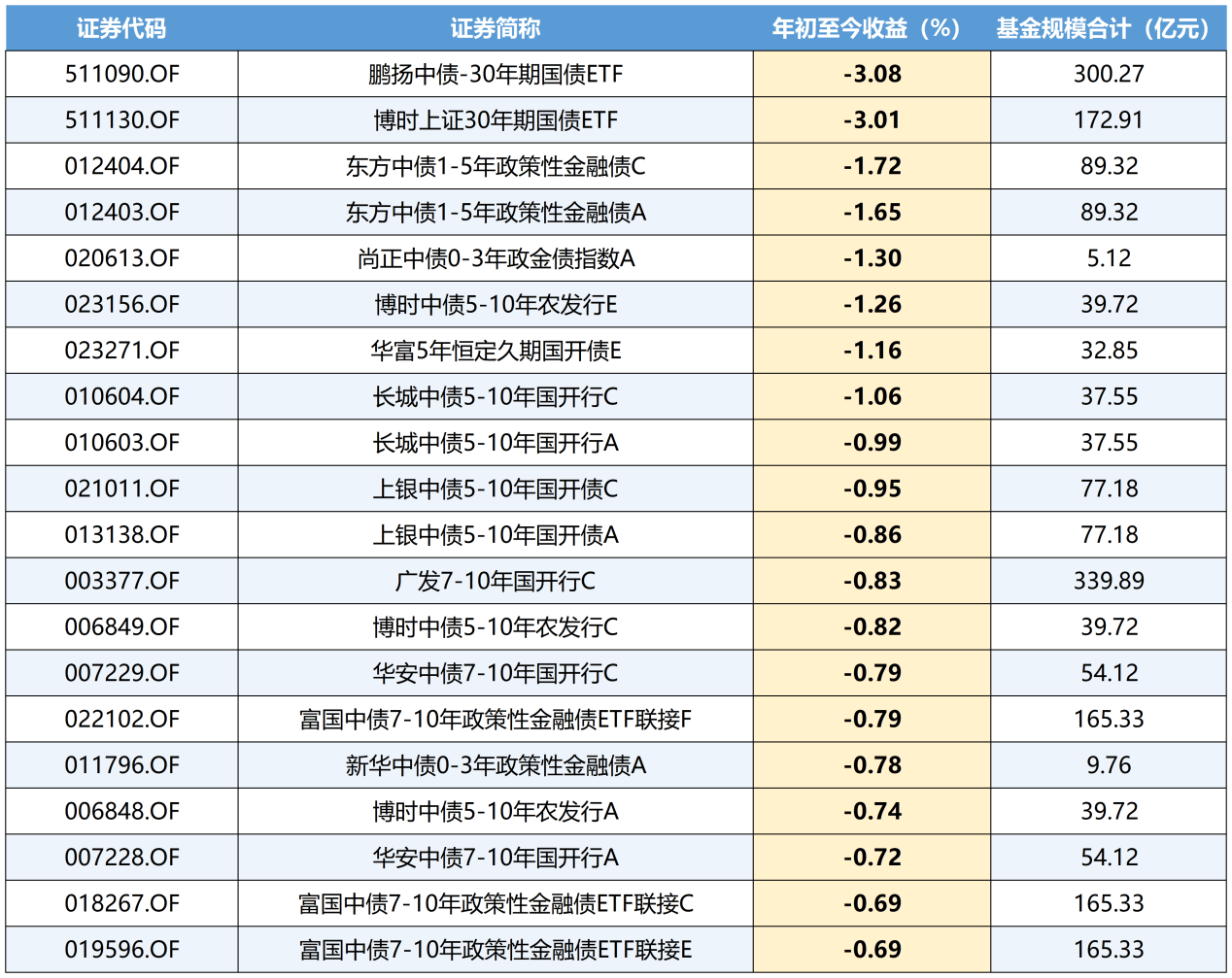 市场表现的确如此。大河财立方记者梳理发现,部分在2024年规模大涨的中长期纯债基金,年初至今还为负收益。例如规模339.89亿元的广发7~10年国开行收益为-0.83%,规模165.33亿元的富国7~10年政策性金融债ETF联接收益为-0.79%,而两只30年期国债ETF年双双跌超3%。