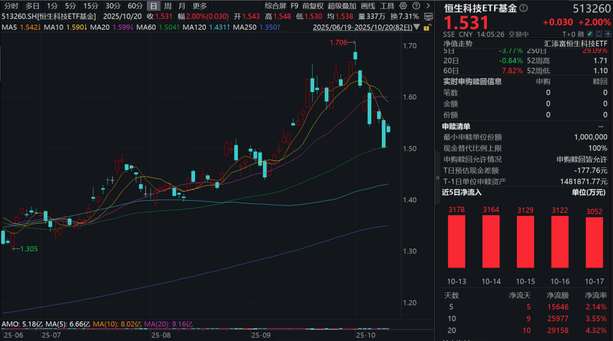同类唯一15BP最低档管理费的恒生科技ETF基金(513260)亦涨超2%,盘中成交额超5亿元,已连续6日获资金顶级申购,近20日“吸金”近3亿元,最新规模超68亿元!基金融资余额再度攀升,维持1.5亿元以上高位!