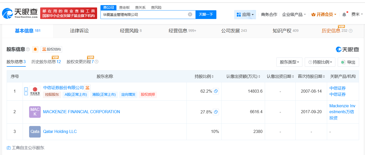 华夏基金管理有限公司成立于1998年4月,注册资本2.38亿人民币,经营范围包括基金募集、基金销售、资产管理等。股东信息显示,该公司由中信证券股份有限公司、MACKENZIE FINANCIAL CORPORATION、Qatar Holding LLC共同持股。