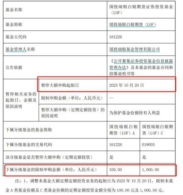 继三天前限购后,国投瑞银白银期货升级限购。自10月20日起,该基金A类和C类份额最新申购限额分别低至100元和1000元,较之前大幅调降。