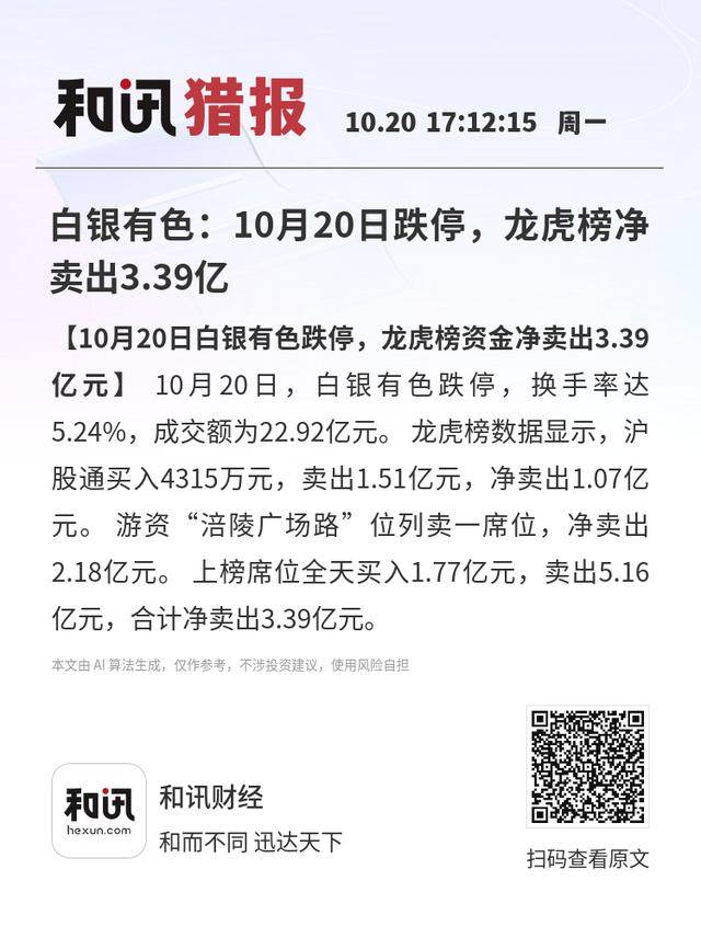 【10月20日白银有色跌停,龙虎榜资金净卖出3.39亿元】10月20日,白银有色跌停,换手率达5.24%,成交额为22.92亿元。 龙虎榜数据显示,沪股通买入4315万元,卖出1.51亿元,净卖出1.07亿元。 游资“涪陵广场路”位列卖一席位,净卖出2.18亿元。 上榜席位全天买入1.77亿元,卖出5.16亿元,合计净卖出3.39亿元。