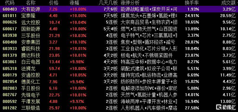 焦点股方面,寒潮概念表现活跃,煤炭股大有能源11天7板、宝泰隆7天5板,燃气股国新能源5天4板。此外,棕榈油概念股远大控股晋级5连板,存储芯片上游材料的三孚股份走出4连板。